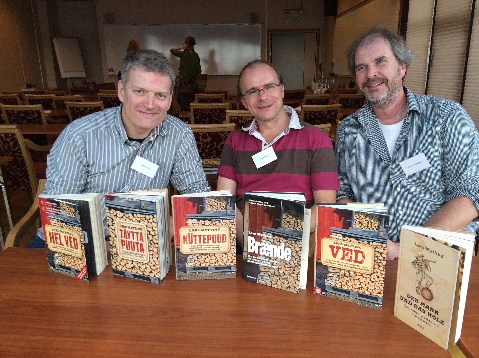 Fra venstre: Lars Mytting, Frank Zuber og G​ü​nther Frauenlob poserer med utgaver av "​​Hel ved​​" p​å seks ulike spr​å​k. Foto: Anne Cathrine Straume