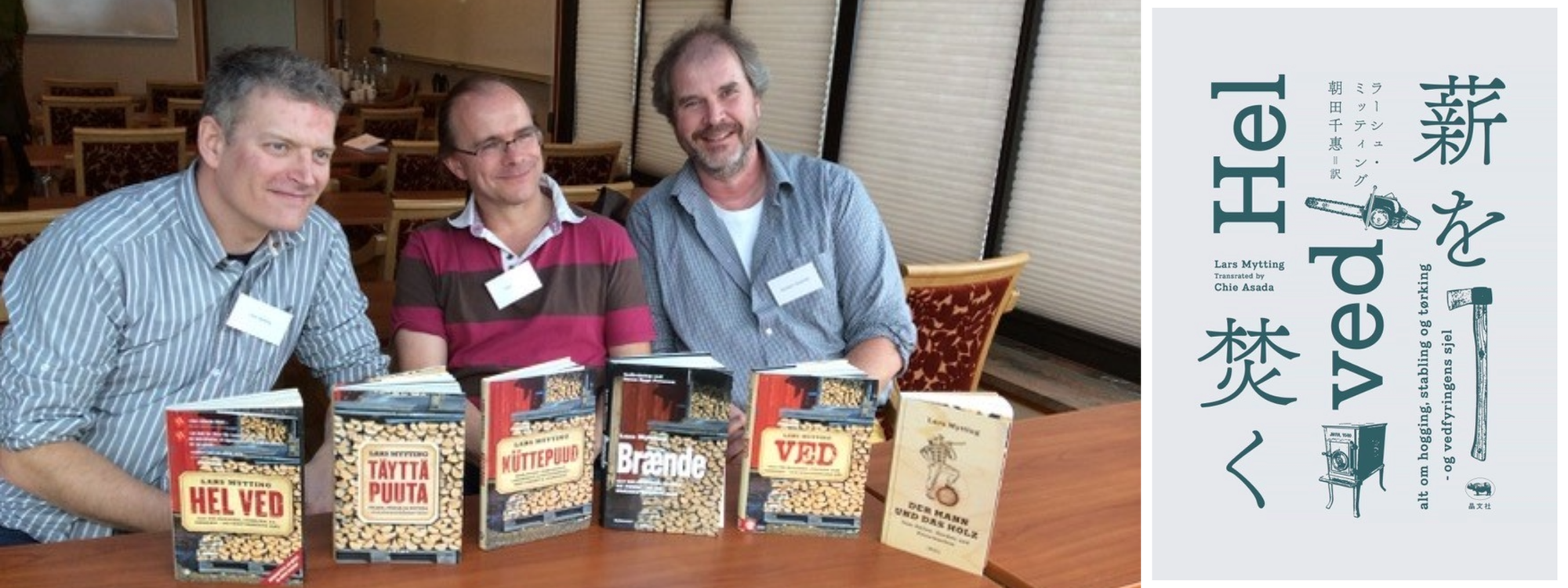 På den tida ble jeg invitert til en oversetterkonferanse i NORLAs regi. Der deltok jeg i sesjonen med Lars Mytting og hans tyske oversettere av Hel ved; Frank Zuber og Günther Frauenlob. Mytting spurte da oss i rommet om det var noen som ville oversette boka. Det var litt morsomt for de store mennene å se ei lita kvinne fra Asia rekke opp hånda, og kanskje var de litt skeptiske om hun ville klare det, tenker jeg nå. Men det bildet av dem som jeg tok der har hele tida vært en oppmuntring for meg. Målet mitt var å en dag sette den japanske versjonen ved siden av alle de andre fra hele verden. Og fem år seinere slo det til. Under et litteraturseminar på Den norske ambassaden i Tokyo traff jeg forlaget som var positive til å gi ut Hel ved. Derfor takker jeg alltid oppriktig NORLA og ambassaden som arrangerer slike seminarer i Japan.