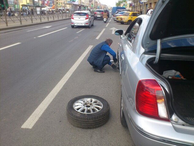 Den rare lyden kommer fra venstre forhjul. Dekket er like flatt som landskapet vi akkurat har kjørt gjennom. Alle ut av bilen. Ut med bagasjen og frem med reservehjul som ligger under bagasjerommet. Sjåføren triller reservehjulet fram for hjulskift. Leter etter noe i hanskerommet, i bagasjerommet, i hanskerommet igjen. Så gir han opp og finner frem en mynt fra lommen. Med den begynner han å skru opp jekken.