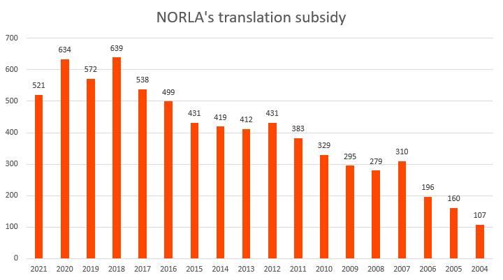 Samlet oversettelsestilskudd fra NORLA var i 2021 på kr. 9.420.600.